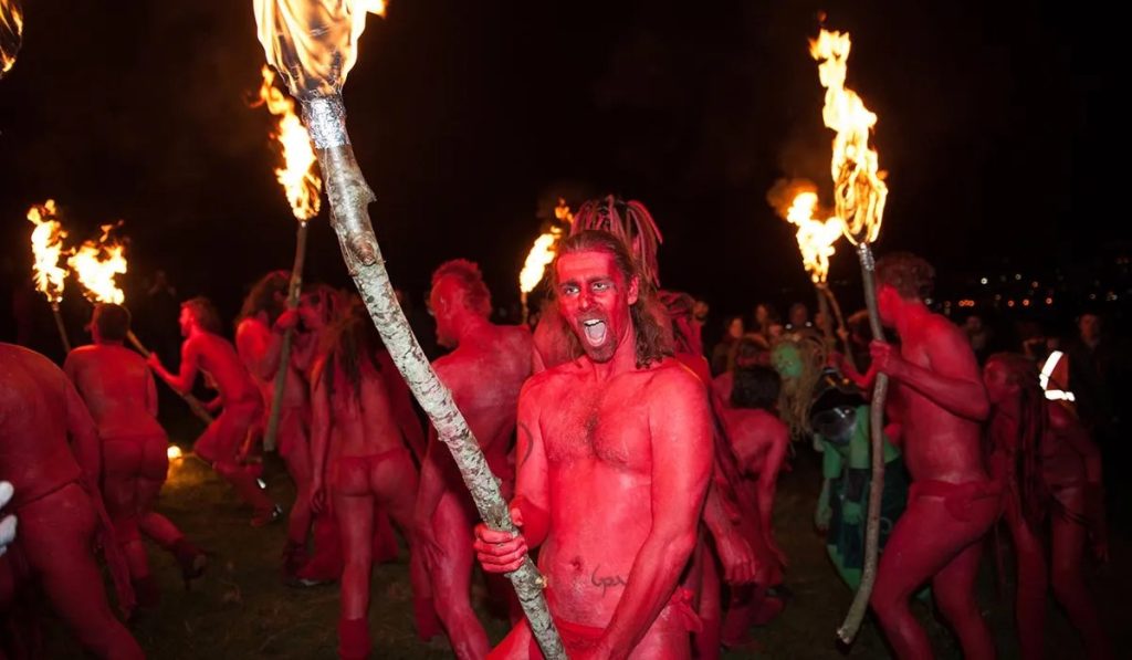 The Edinburgh Beltane Fire Festival, the largest contemporary public observance, includes a procession from Calton Hill led by the May Queen and the Green Man, attended by drummers and elemental performers (red men, blue men, white women, etc.), culminating in the lighting of a great bonfire and the symbolic union of the divine pair.